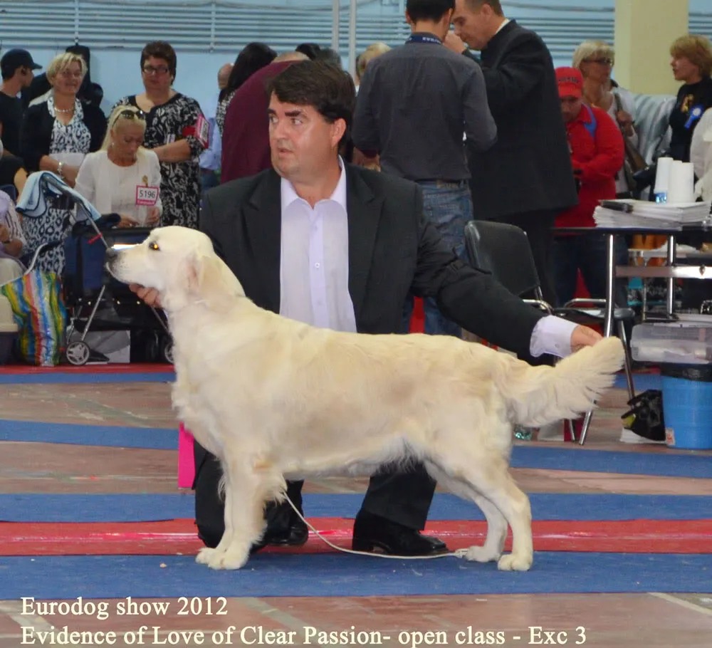 The sisters were daughters of the beautiful Remington Ringmaster, an outstanding stud from the UK. Remington Ringmaster carried important bloodlines, including those of the Remington, Westley, and Ritzilyn lines. In particular, his bloodline traces back to Eng Sh Ch Ritzilyn Brandon, a top-winning Golden Retriever in Great Britain. All three imports quickly proved their worth, excelling in the show ring and completing their championships. CH Thevenet Quizas Manana Sea Tarde made us especially proud by winning her class at the European Dog Show 2012 under Judge Kari Järvinen from Finland. This victory made the 2012 European Dog Show a particularly memorable one for us, as we achieved a remarkable success with our dogs. In addition to Thevenet Quizas Manana Sea Tarde’s win in the intermediate females class, our homebred champion male, Picture Perfect of Clear Passion, won the intermediate males class, and our homebred champion female, Evidence of Love of Clear Passion, earned an Excellent 3 in the open class. It was a truly special moment for our kennel.